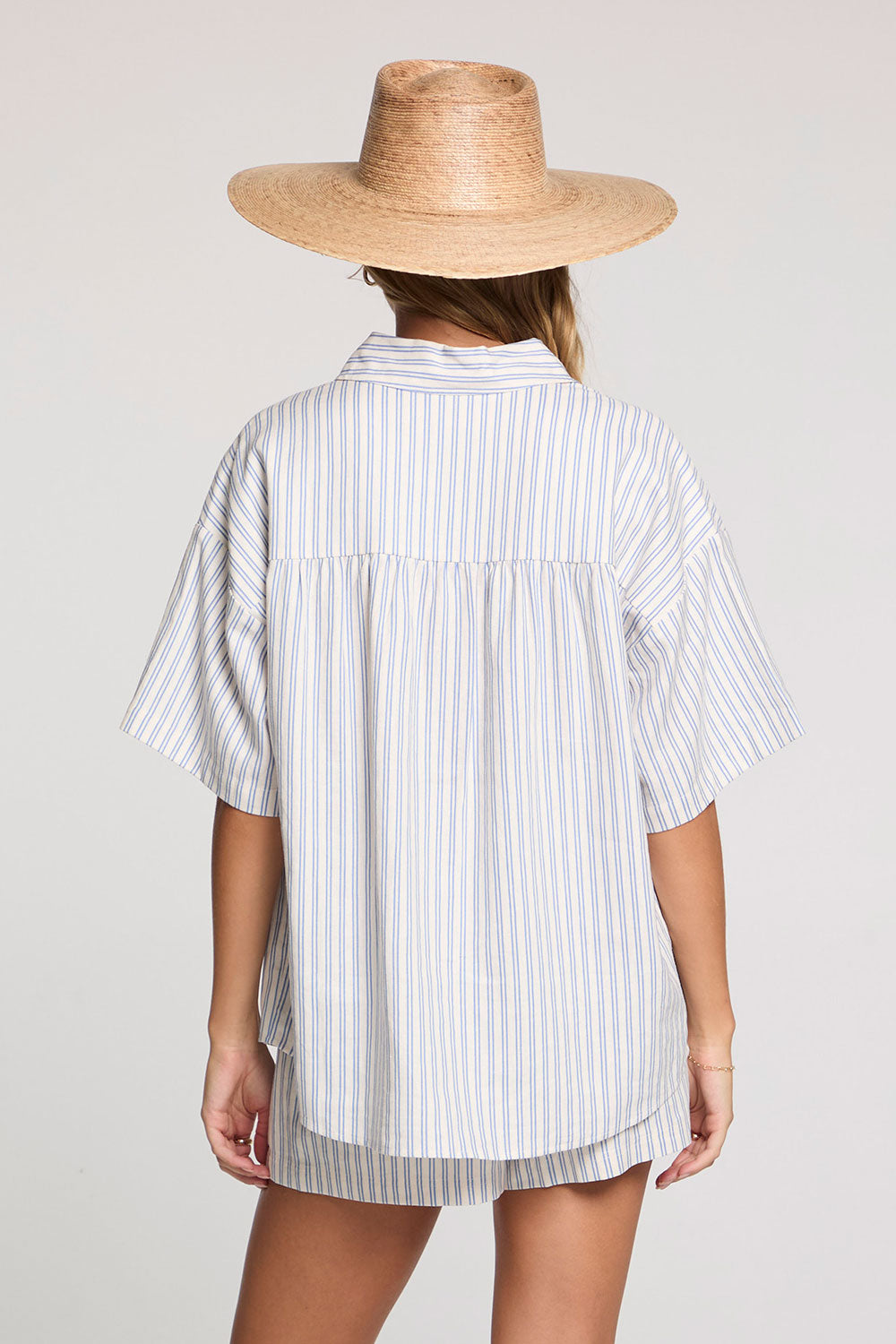 Made with a petite ocean striped fabric, this boxy top exudes luxury and sophistication.