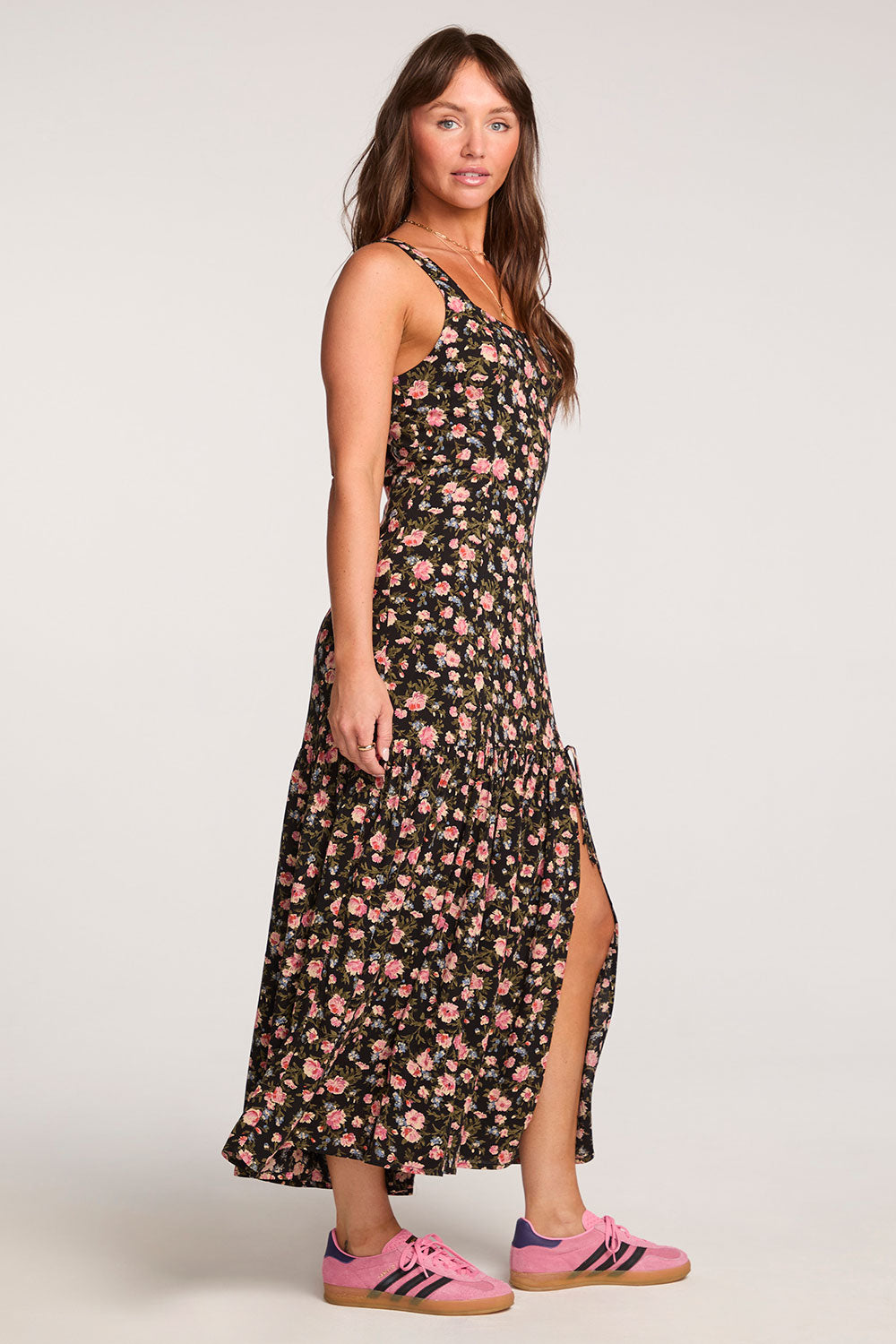The Kollin Midi Dress features a structured top with wide straps and a square neckline, showcasing romantic pink florals on a moody black background.