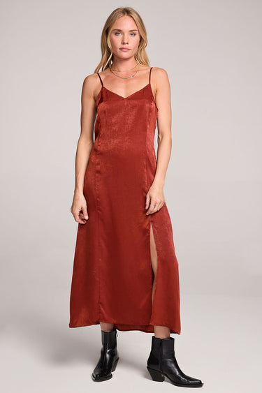 The Tank Rustic Midi Dress features a timeless slip dress silhouette in a rich rustic red hue.