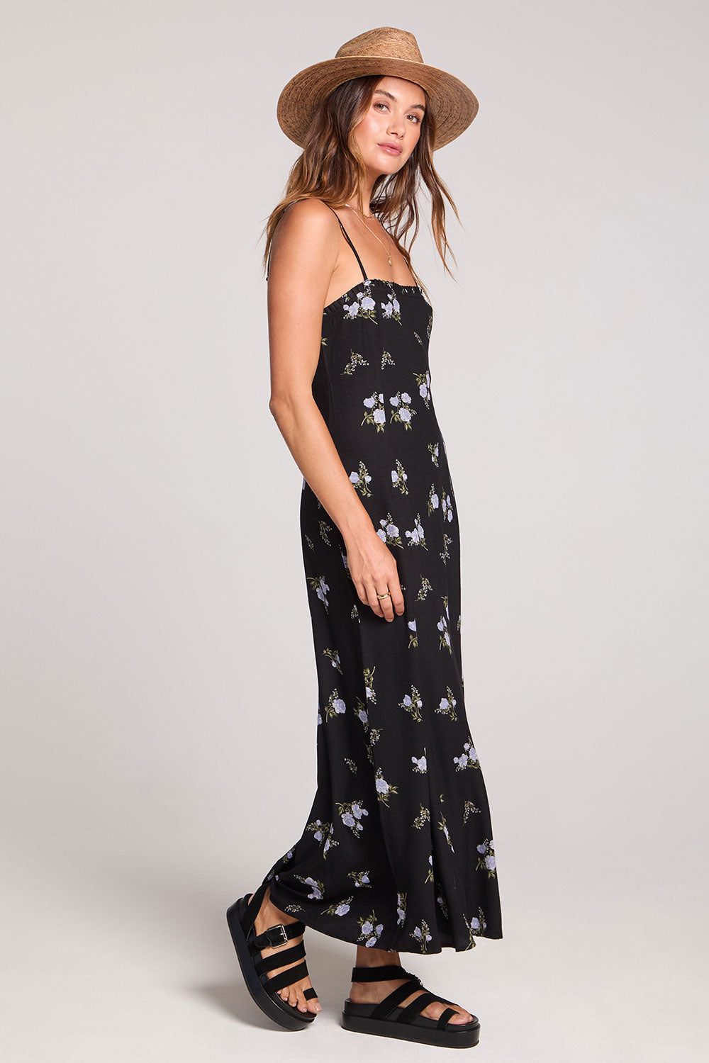 The black and white floral print brings understated charm, while the square neckline and delicate spaghetti straps create a flattering, modern silhouette.