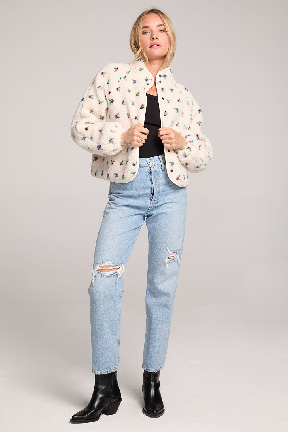 The Deeda Jacket reimagines the classic bomber silhouette with a soft, fluffy fabric adorned by a delicate petite floral motif.