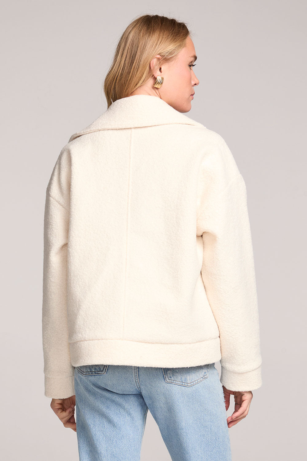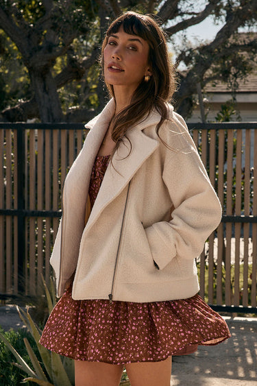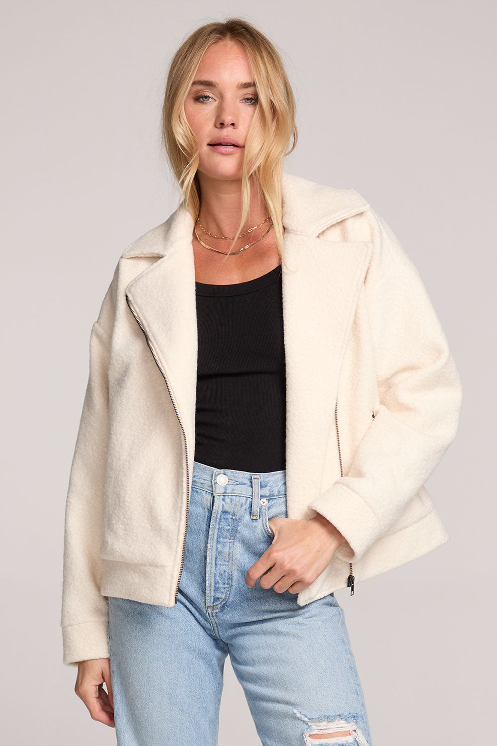 The Ellis Jacket draws inspiration from vintage moto styles, crafted in soft creamy fabric for a refined touch.