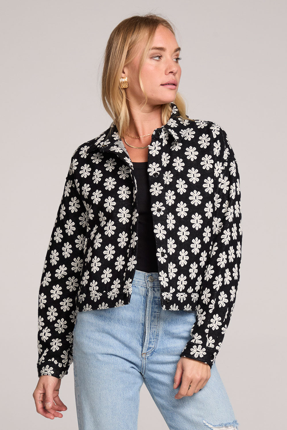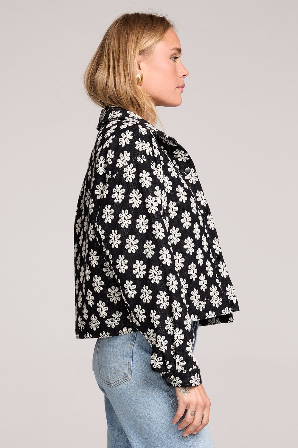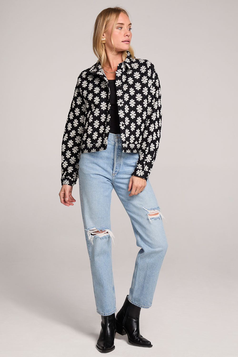 The Jayme Jacket features a boxy cropped silhouette with full-length sleeves, showcasing a retro white daisy design on black fabric.