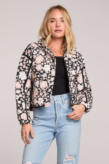 The Leni Jacket showcases a cute cropped silhouette adorned with elegant black and white floral patterns and refined black line detailing along the sleeves.