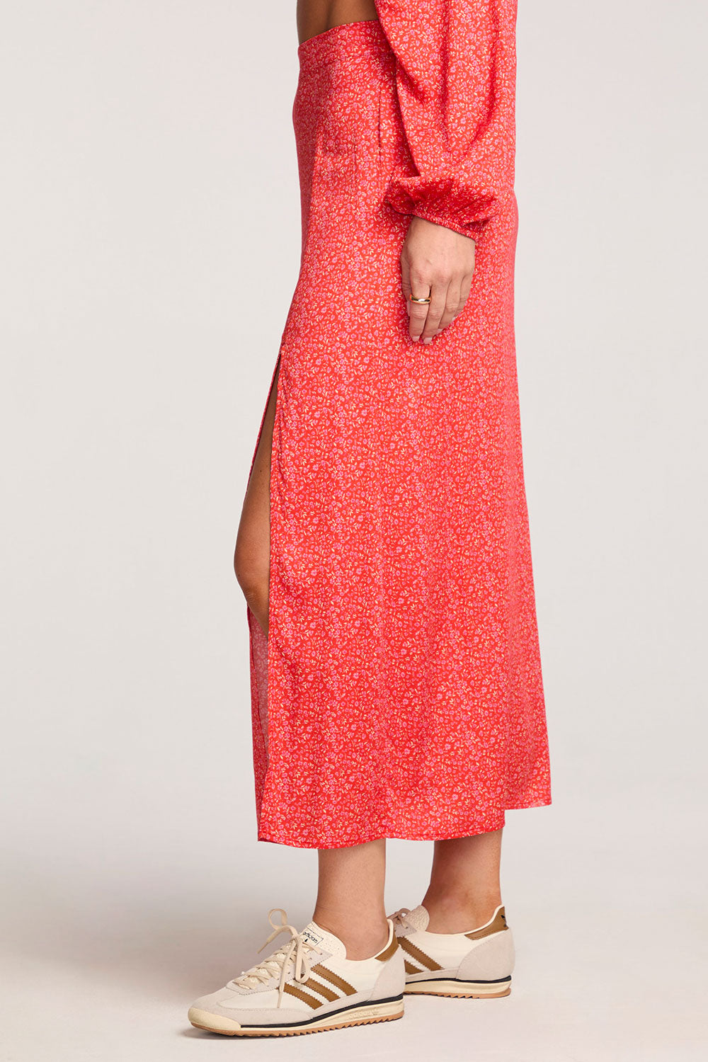 The Narissa Vintage Red Midi Skirt offers a chic and sophisticated silhouette with a high waist and classic panel design.