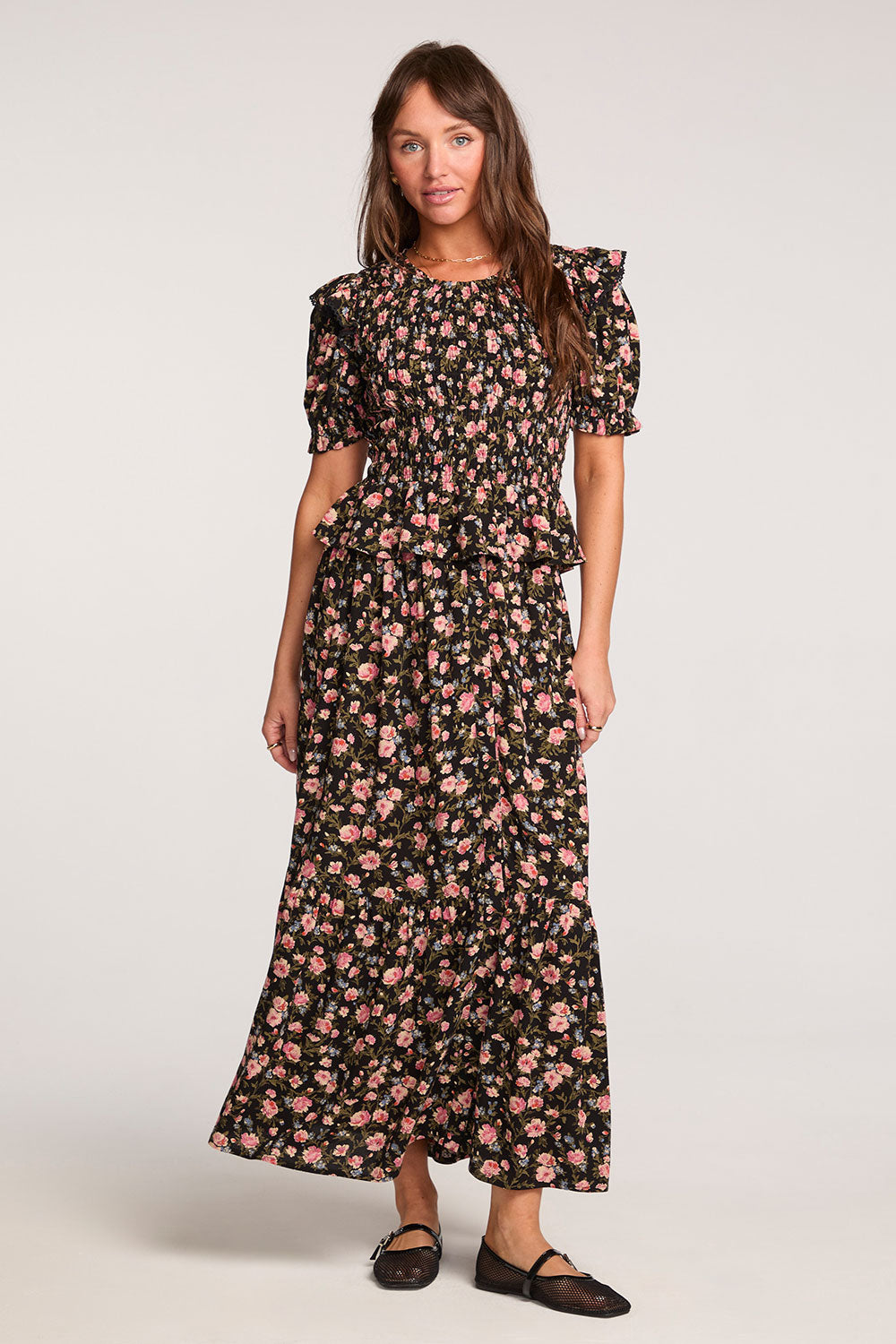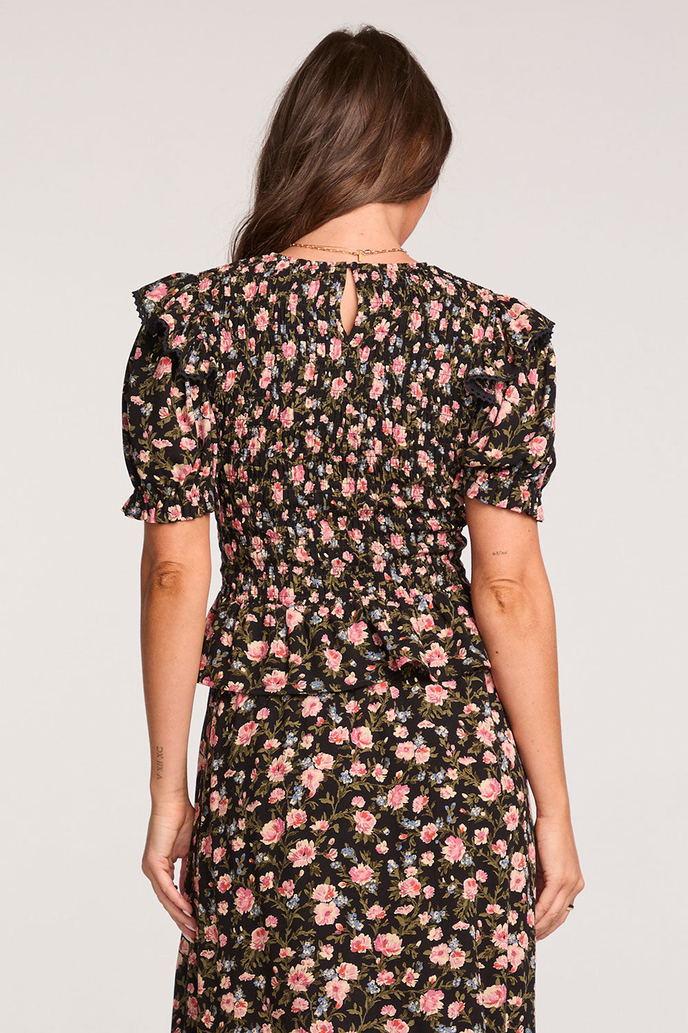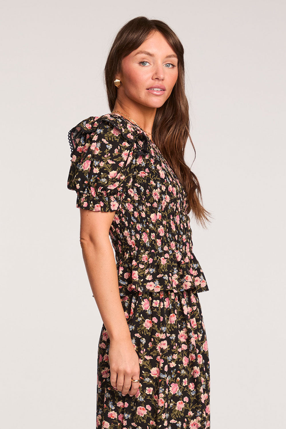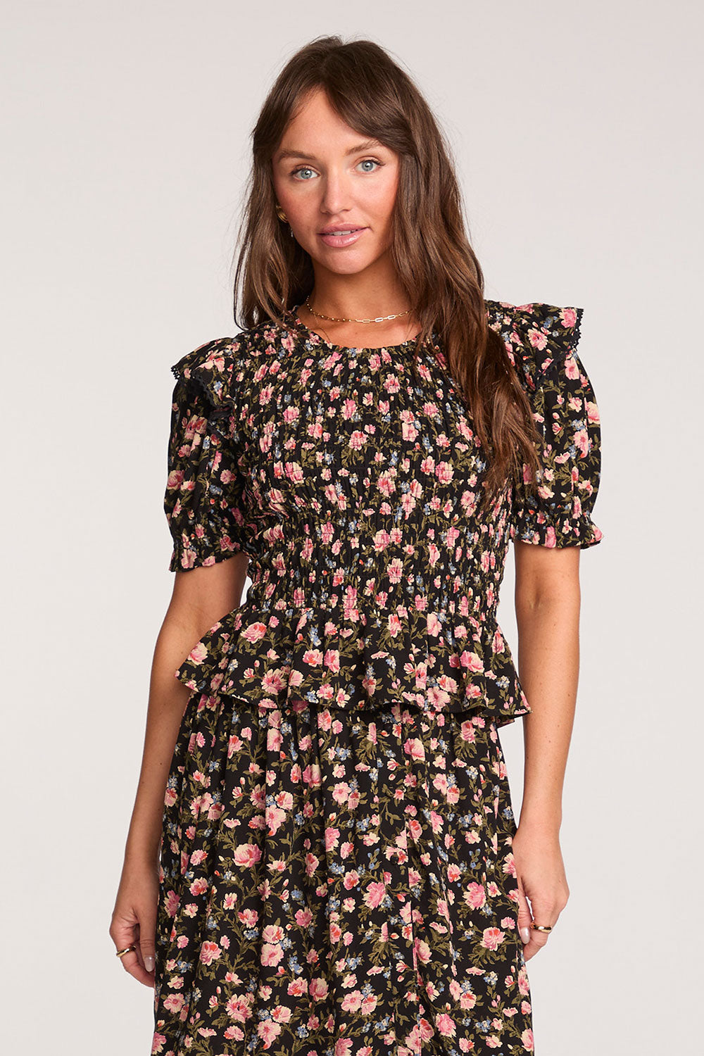 The Skylor Top features a romantic, old-fashioned design with sweet pink florals on moody black fabric.