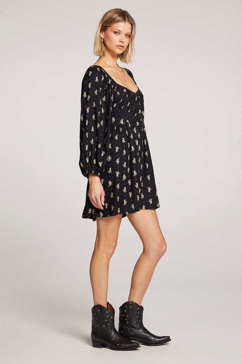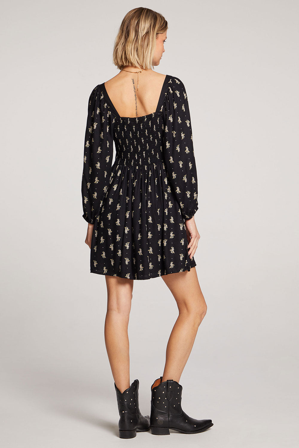 The simple black fabric goes with everything in your closet, while a petite floral motif lends softness to the look.