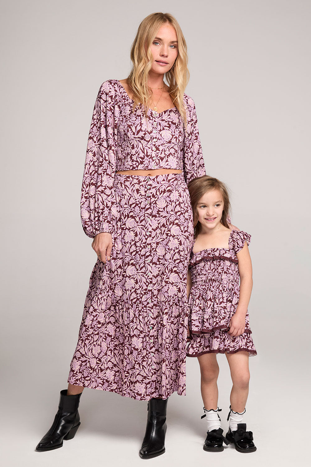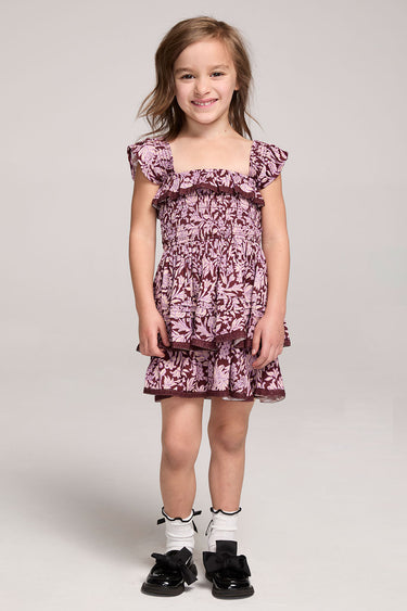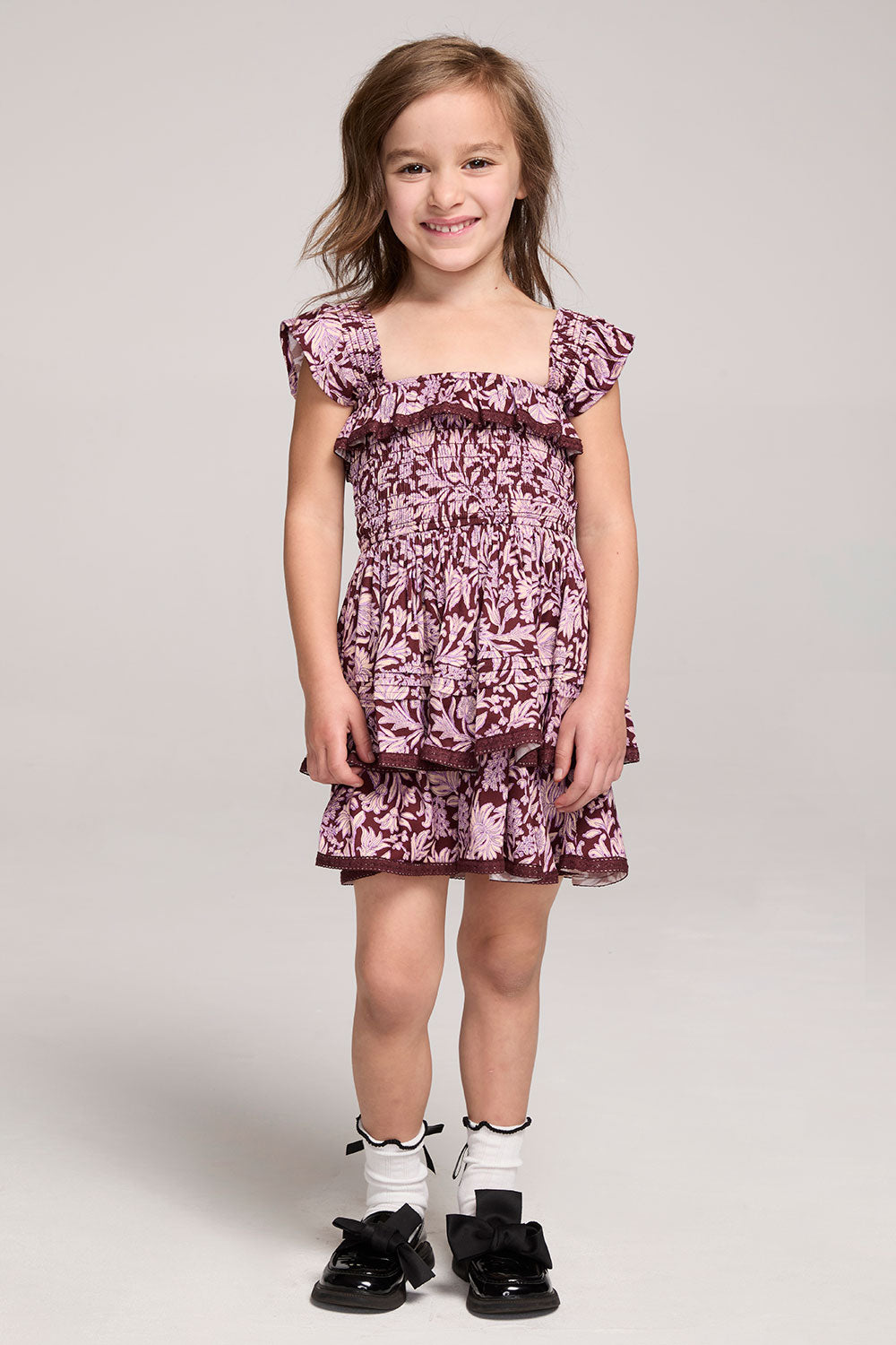 The Norah Sangria Mini Dress features a playful tiered skirt that flutters with every step.