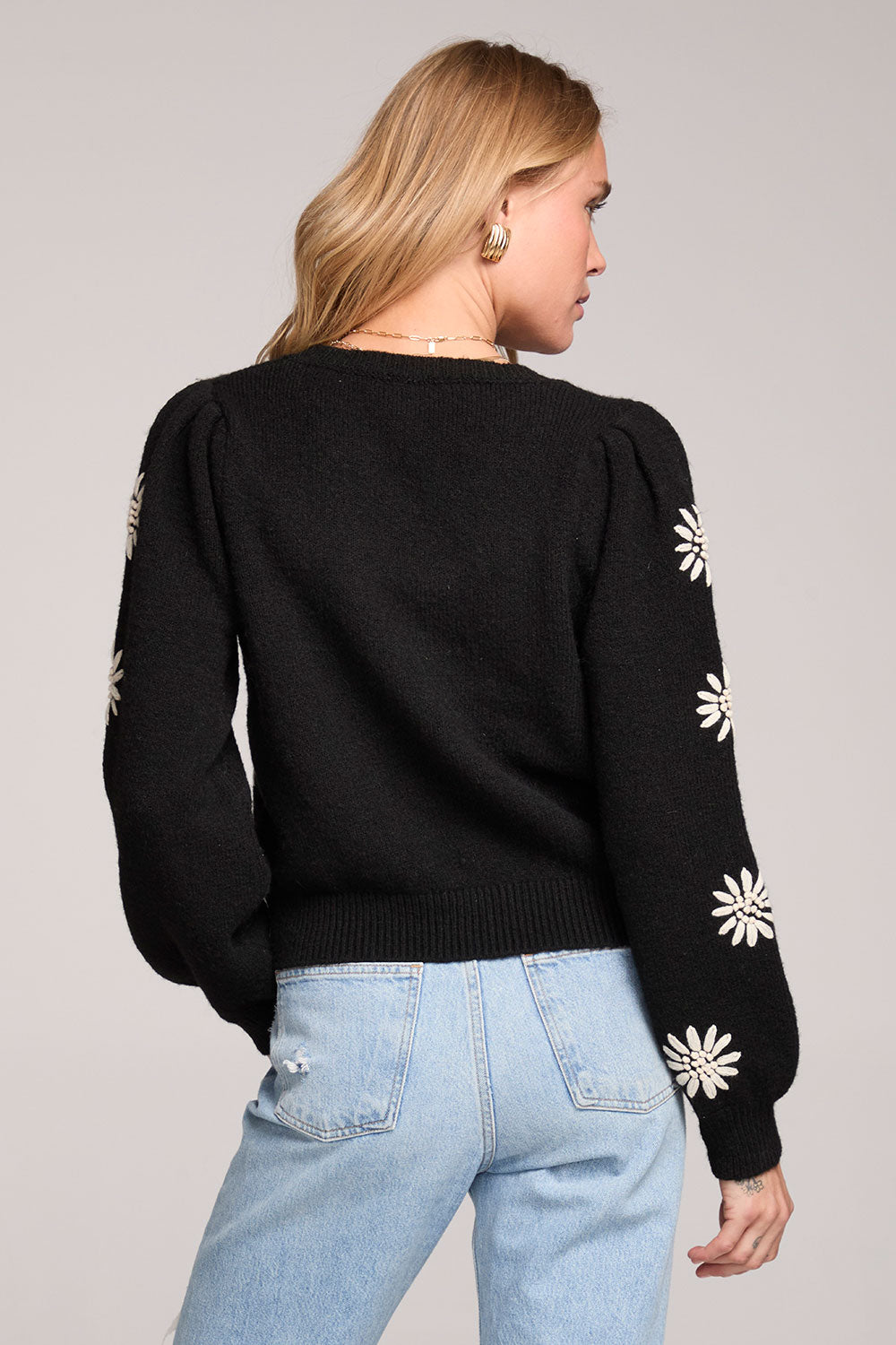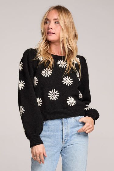 The Elima Sweater channels 60s-inspired vintage elegance with an oversized white daisy motif on classic black fabric.