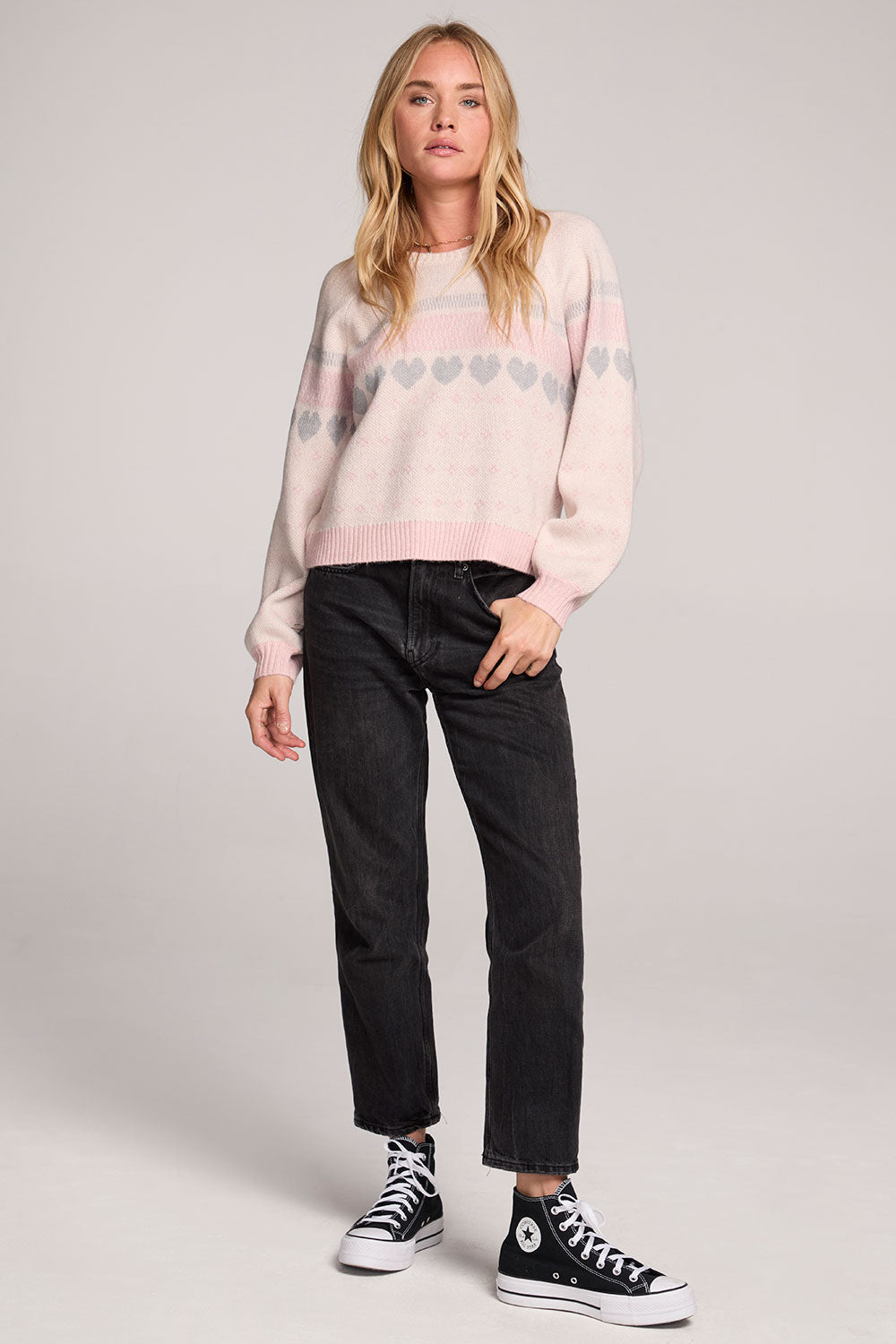 Its high scoop neck and sweet neutral-toned heart and stripe design add subtle charm to this effortlessly chic piece.