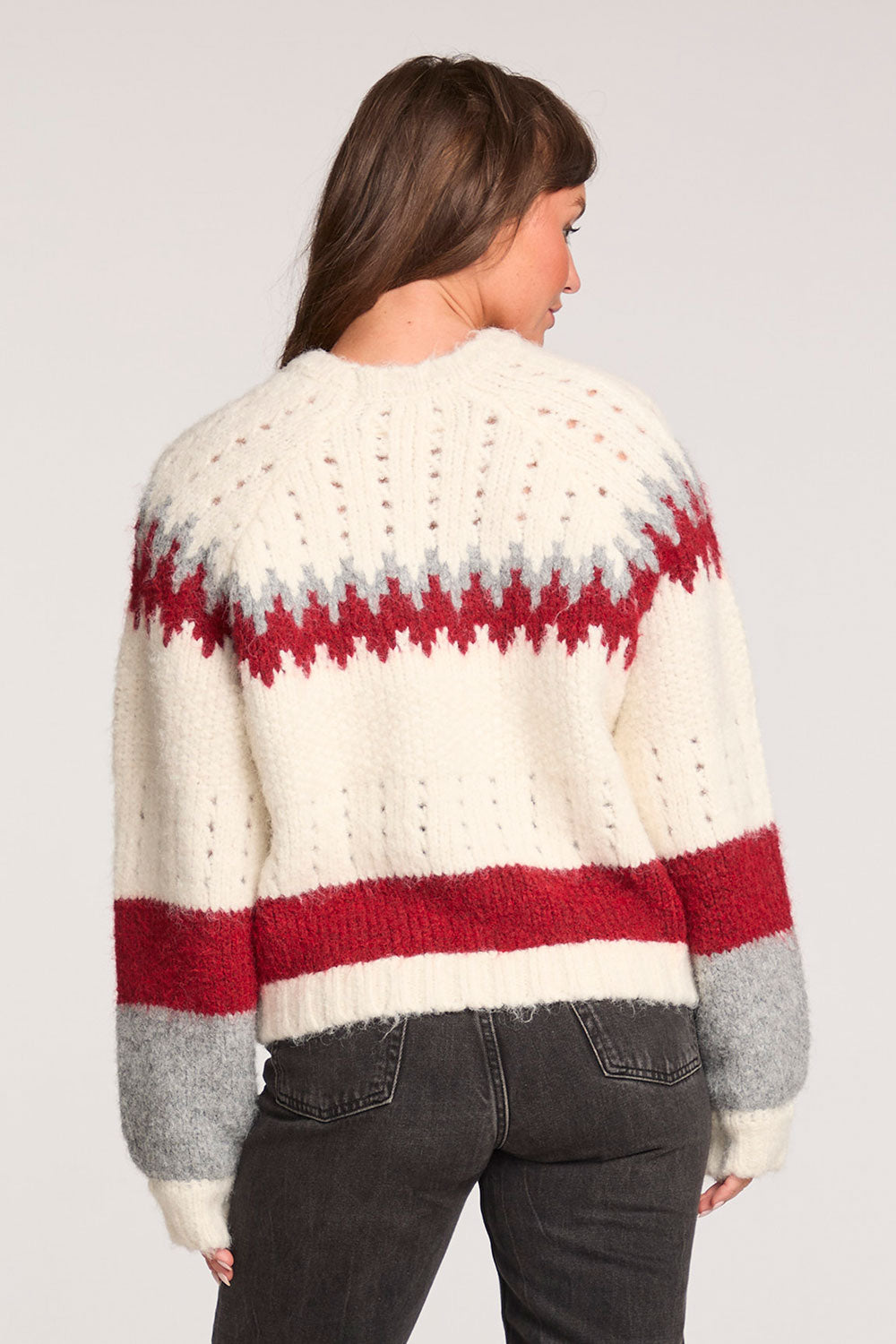 Inspired by Nordic knitwear, the Revel Sweater features a striking crimson pattern contrasted with elegant grey and white hues.