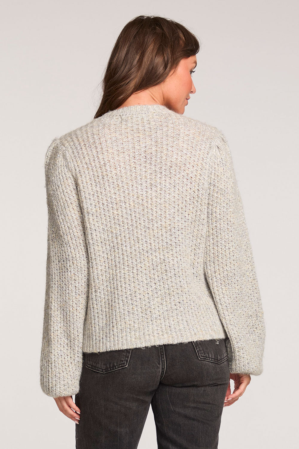 The Margow Sweater features a soft grey fabric with slouchy sleeves and a high neckline, offering a refined yet relaxed silhouette.