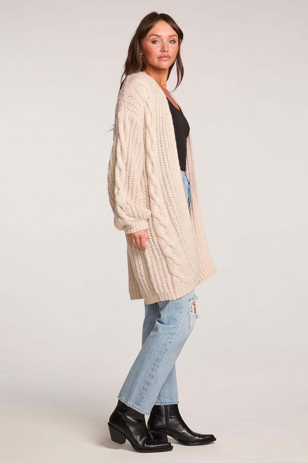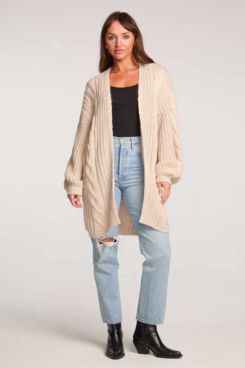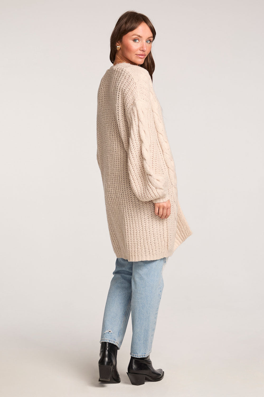 The Aziel Pearl Sweater is a cozy duster cardigan crafted from textured knit fabric, offering an oversized, roomy fit for ultimate comfort.