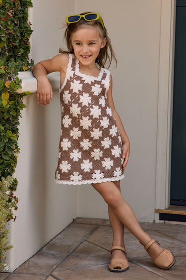 In a mocha colorway, this 60s inspired dress features a crochet look with scalloped detailing at the square neckline and hem.