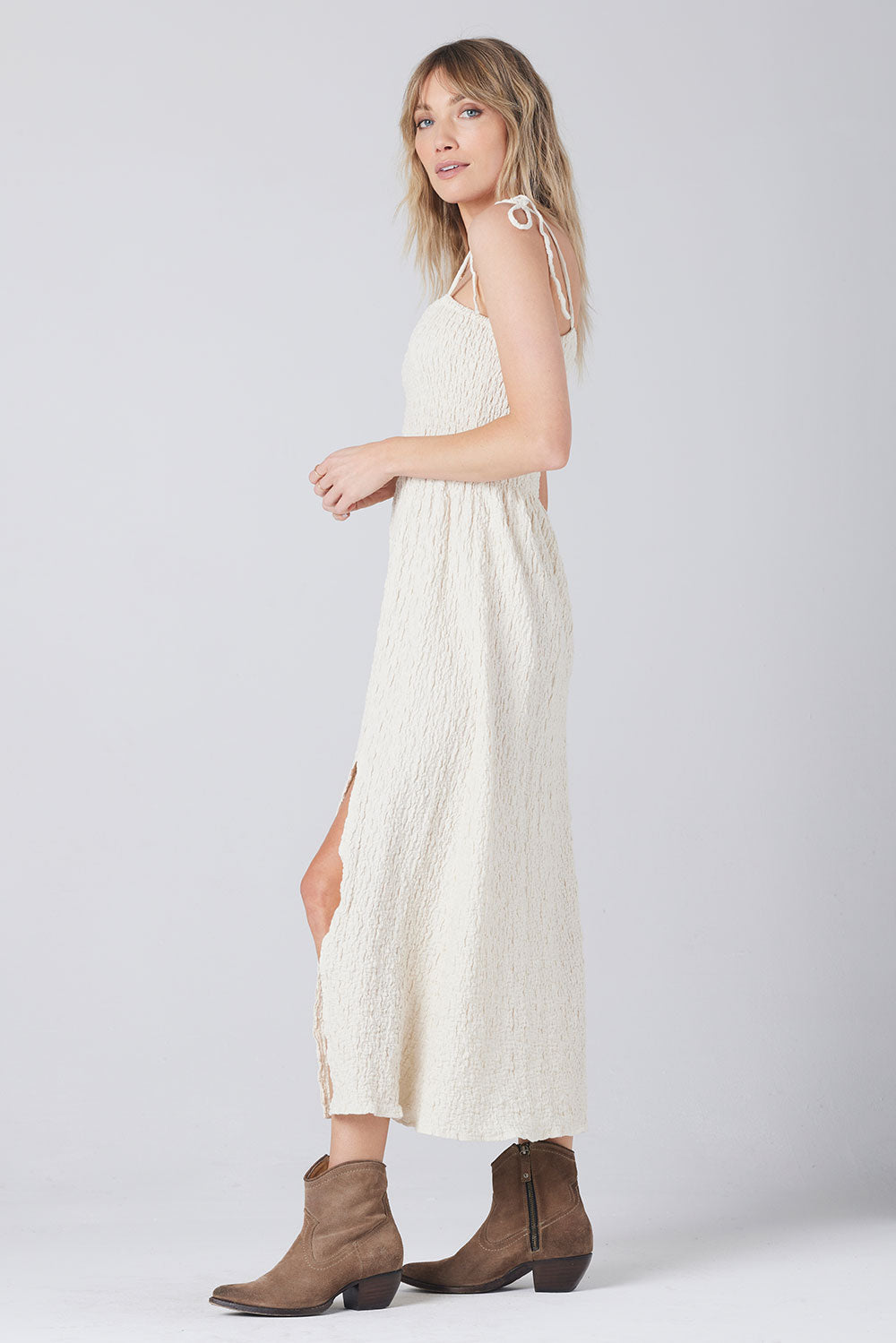 Our Britton Tank Midi Dress features a smocked bodice fabric and slit up the side.