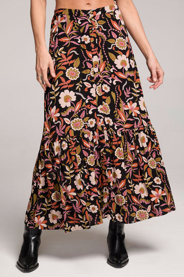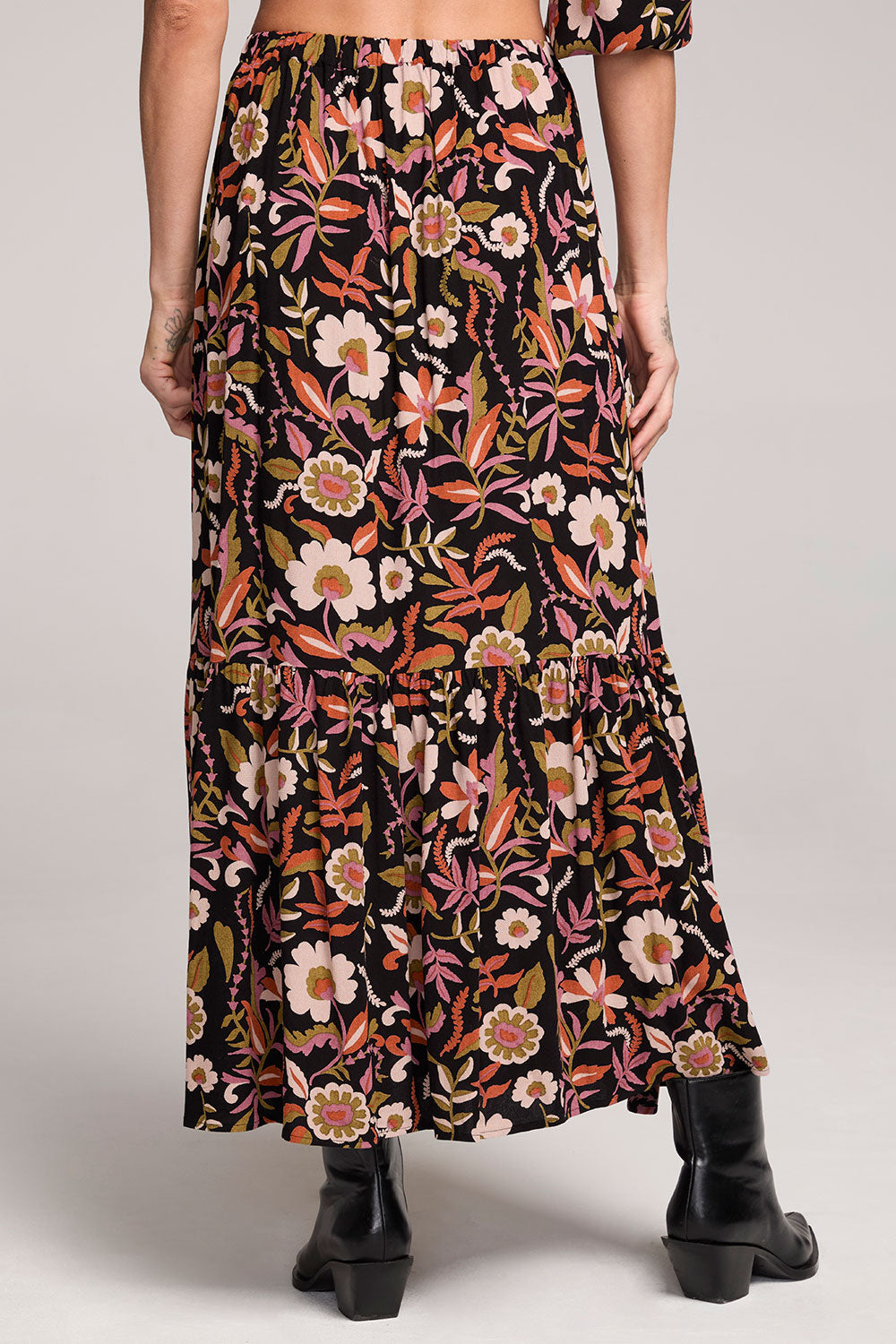 The Carli Maxi Skirt features a full, tiered design that flares into a dramatic wide bell silhouette.