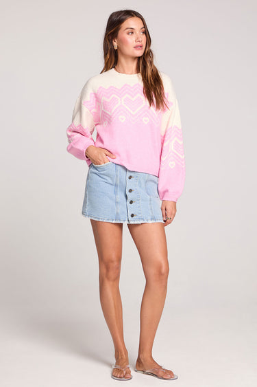 Love is in the details with the Kirra sweater—a romantic knit in soft Dahlia pink and creamy white featuring an adorable heart design.