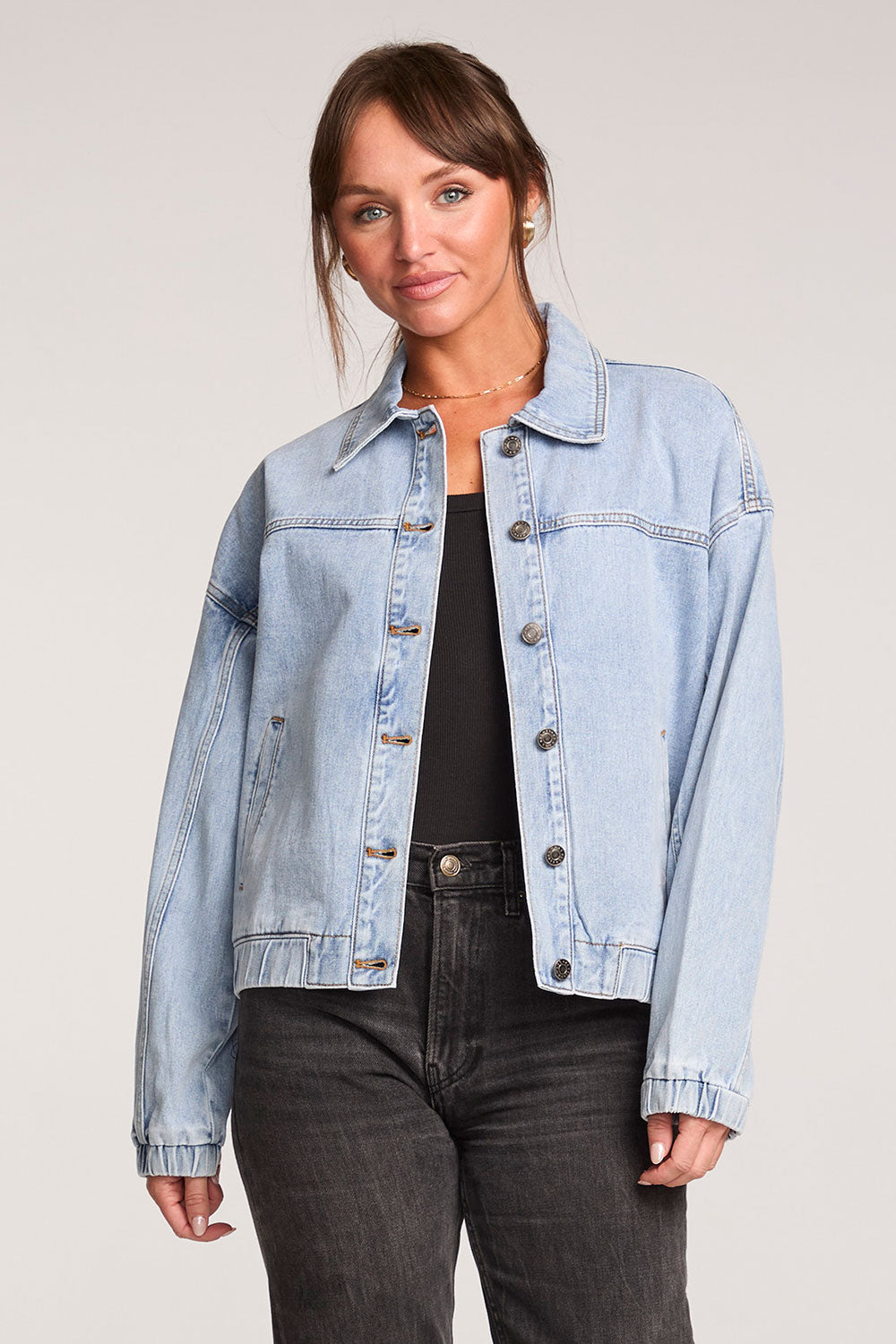 The Lenna Jacket is a classic jean jacket crafted from light denim fabric, featuring a cropped, boxy fit.