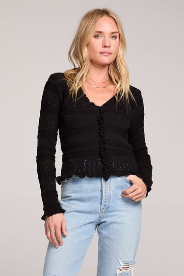 The Marlow Cardigan Sweater is sweet and romantic, featuring petite ruffles at the neckline, hem, and sleeves.