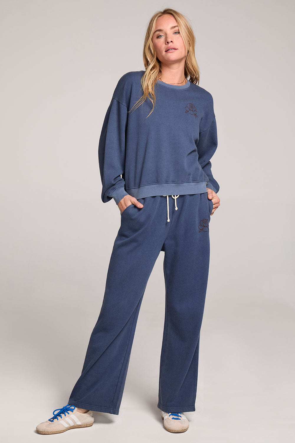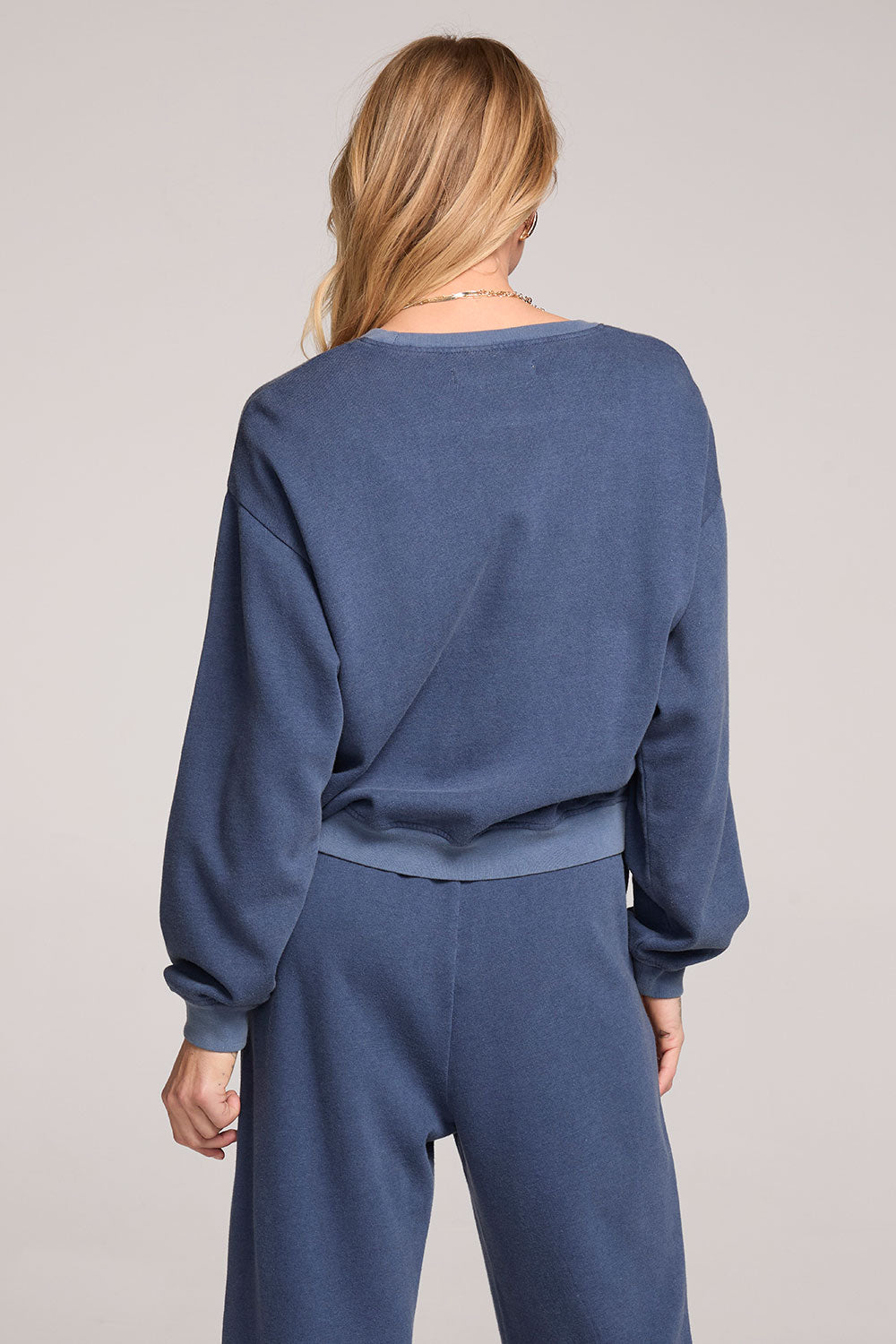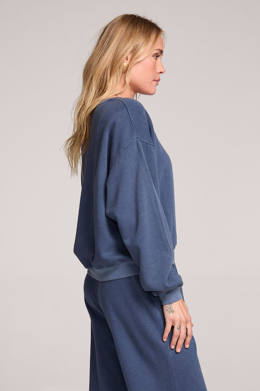 The Perry Pullover in soft blue cotton offers a refined yet relaxed silhouette with its casual boat neck and loose fit.