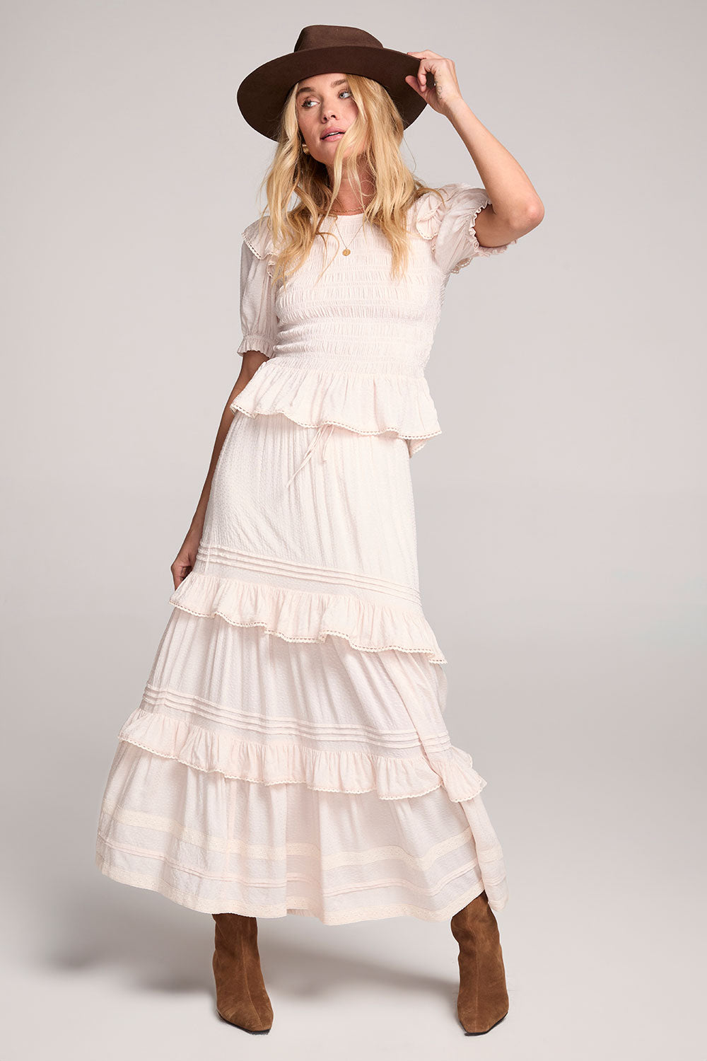 The Regan Midi Skirt offers a sweet silhouette with tiered ruffled hems and a full skirt that gracefully flutters with every stride.