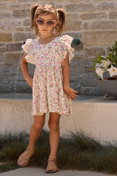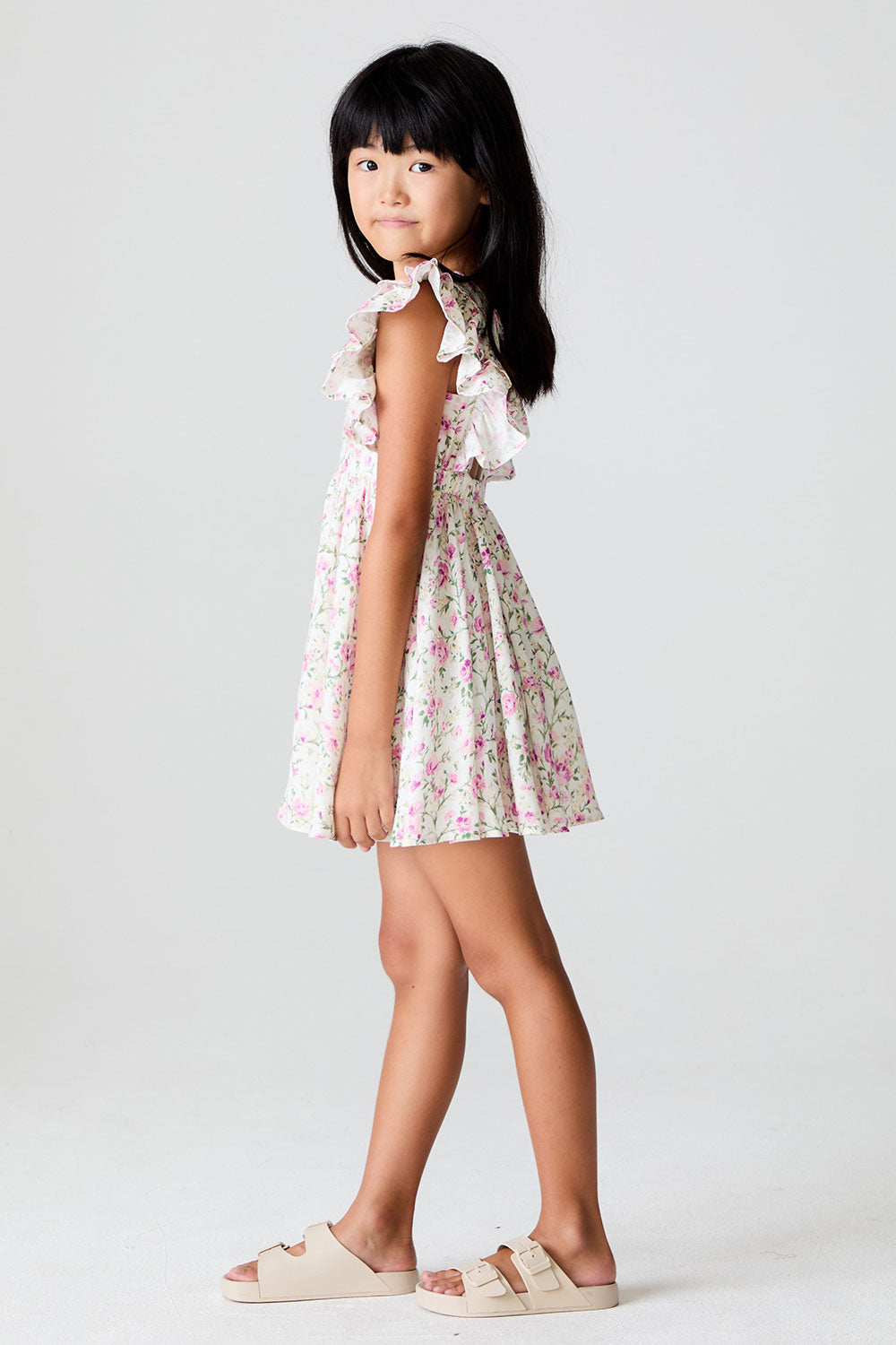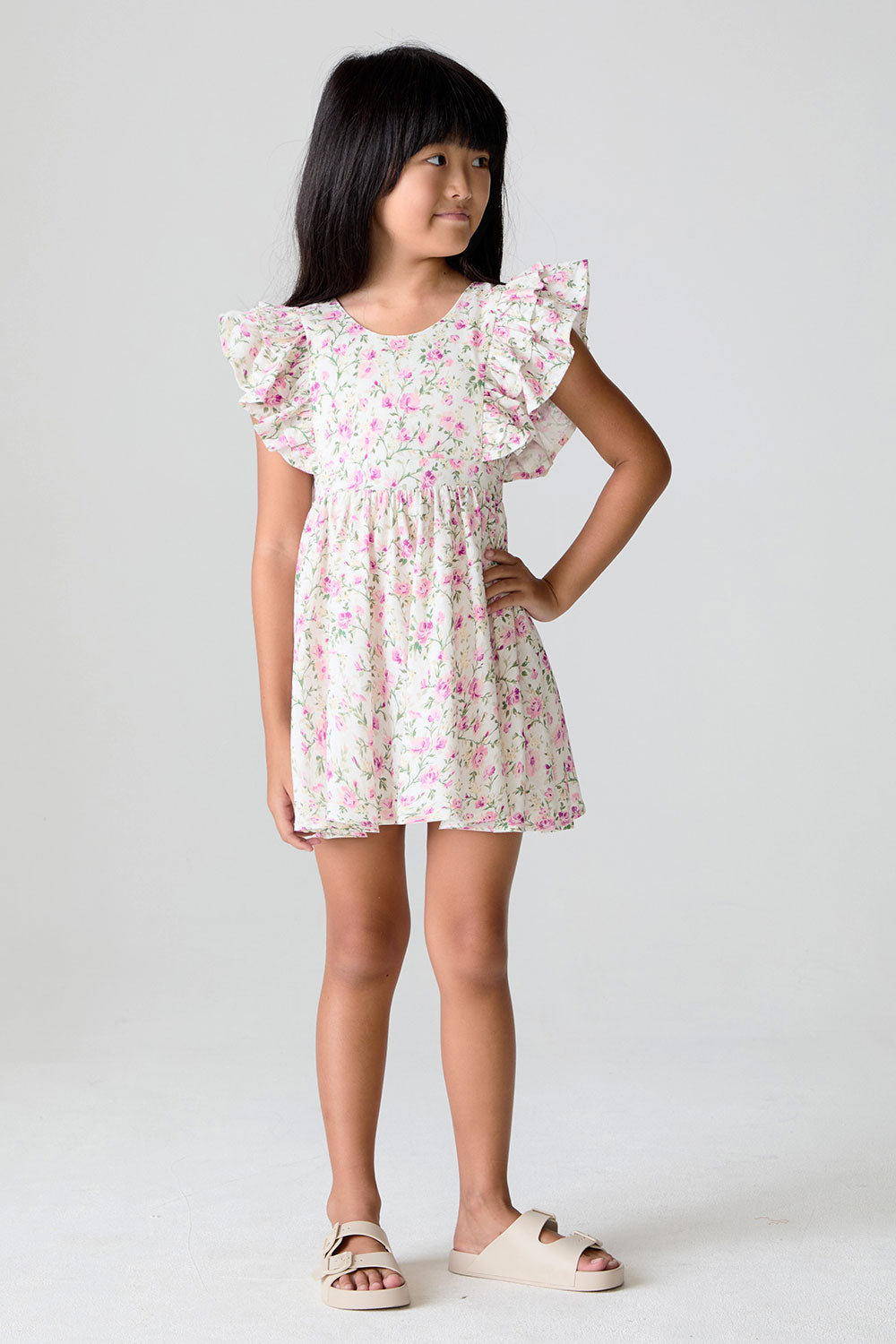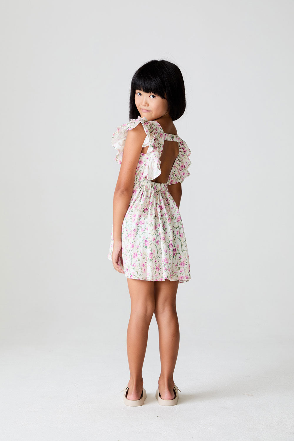 The Brammie Mini Dress captures coastal charm in salt white with graceful floral patterns.