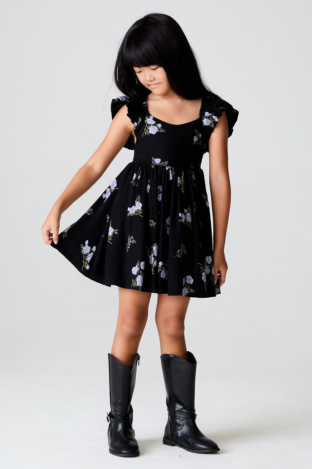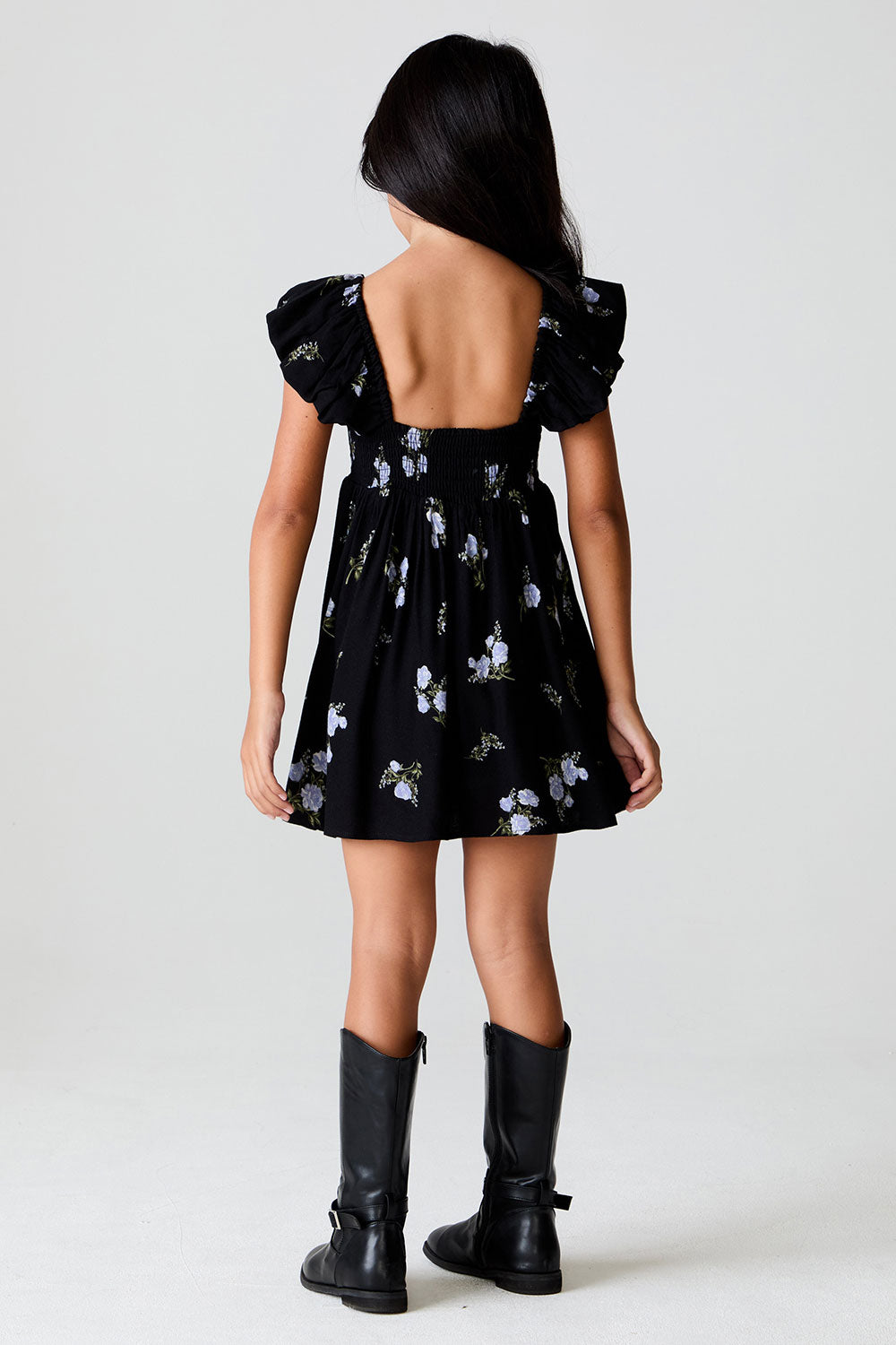 Let her embrace timeless elegance with the Crockett Mini Dress, featuring delicate floral patterns on a classic black base.