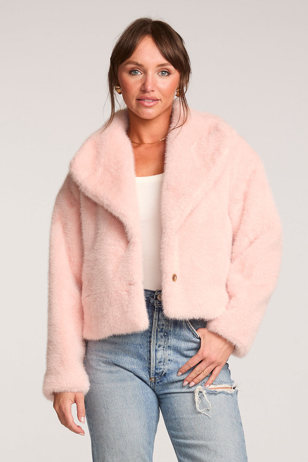 The Silvia Jacket invites you to snuggle up in charming, touchable faux fur.
